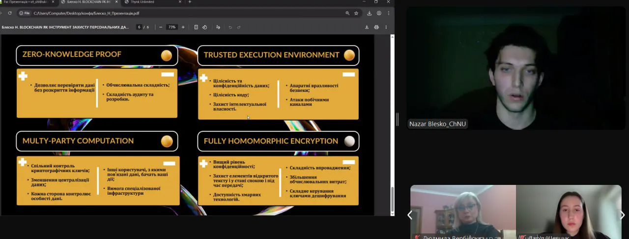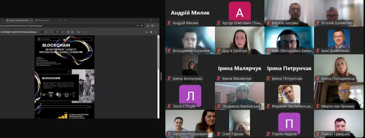 Кафедру бізнесу на пленарному засіданні представив здобувач третього (освітньо-наукового) рівня освіти Назар Блеско з доповіддю «Blockchain як інструмент захисту персональних даних служби HR» (науковий керівник проф. Л.В. Вербівська)