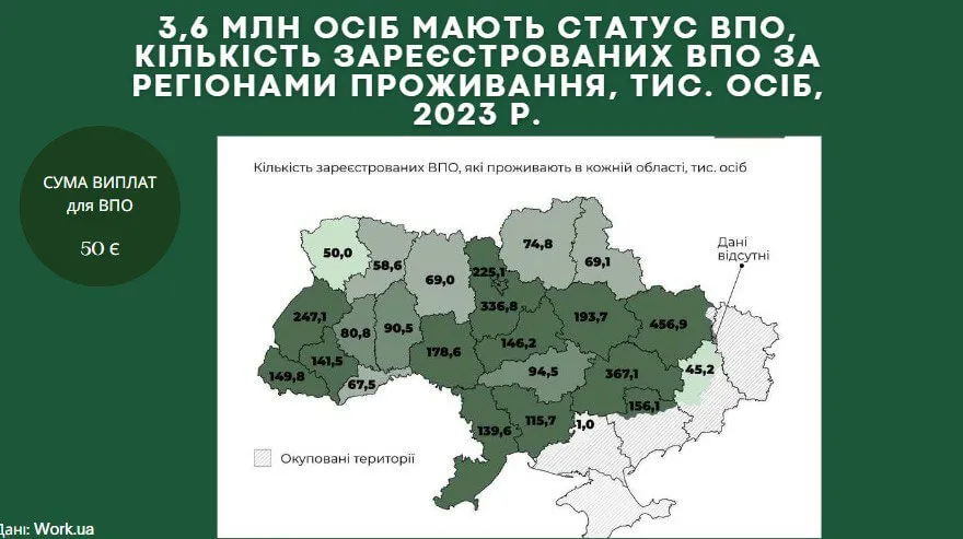 Також увагу було зосереджено на внутрішній міграції, визначено кількість осіб зі статусом ВПО, яку частку вони складають у загальній чисельності працівників.
