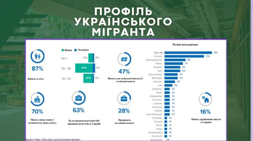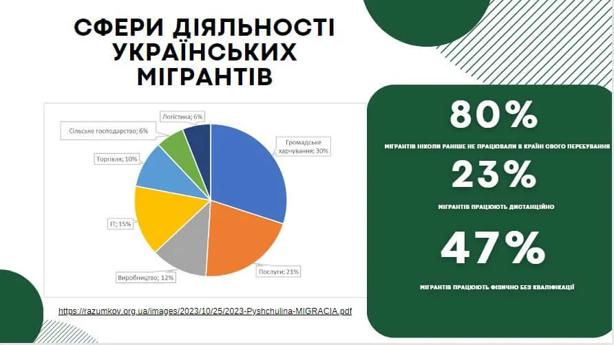 Під час доповіді було розглянуто особливості української хвилі зовнішньої міграції, регіони розселення українців, розміри грошових виплат біженців, сферу діяльності українських мігрантів та сформовано профіль українського мігранта.