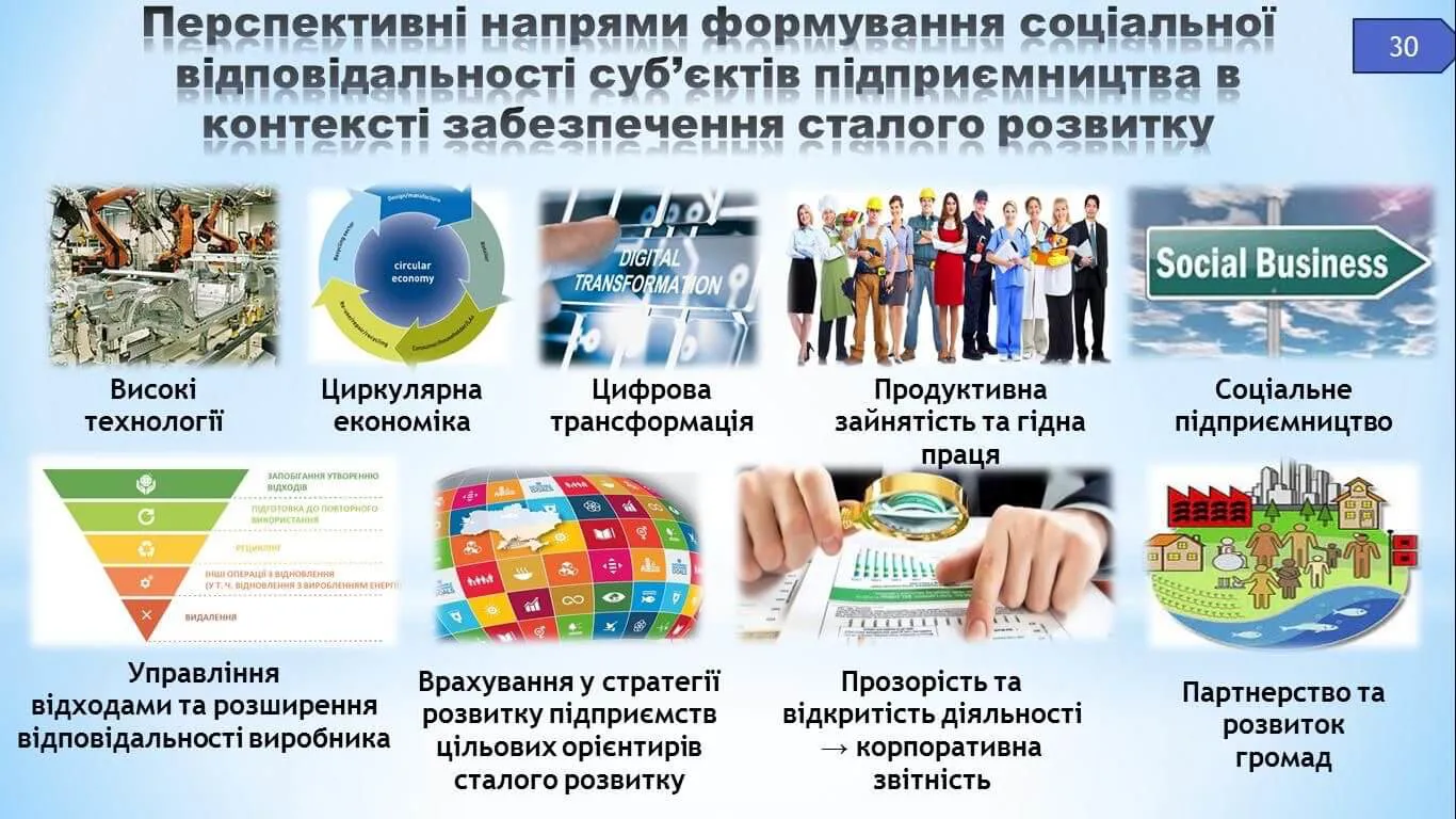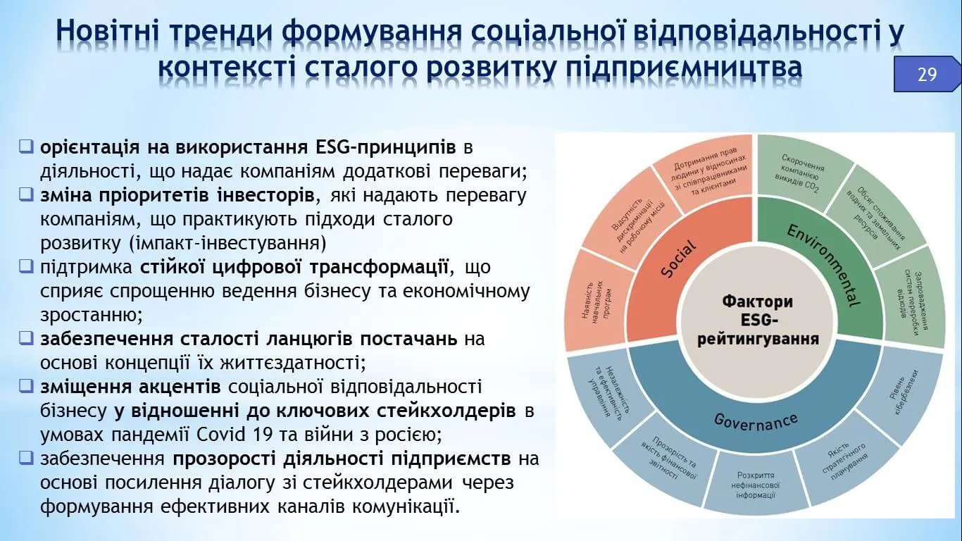 Наприкінці доповіді окреслено новітні тренди формування соціальної відповідальності бізнесу у контексті сталого розвитку, якими визначено орієнтацію на ESG-принципи, зміну пріоритетів інвесторів, підтримку стійкої цифрової трансформації, забезпечення сталості ланцюгів постачань, зміщення акцентів соціальної відповідальності бізнесу у відношенні до ключових стейкхолдерів, забезпечення прозорості діяльності бізнесу. Обґрунтовано перспективні напрями розвитку соціальної відповідальності бізнесу, які дозволять функціонувати йому на сталій основі упродовж тривалого періоду.