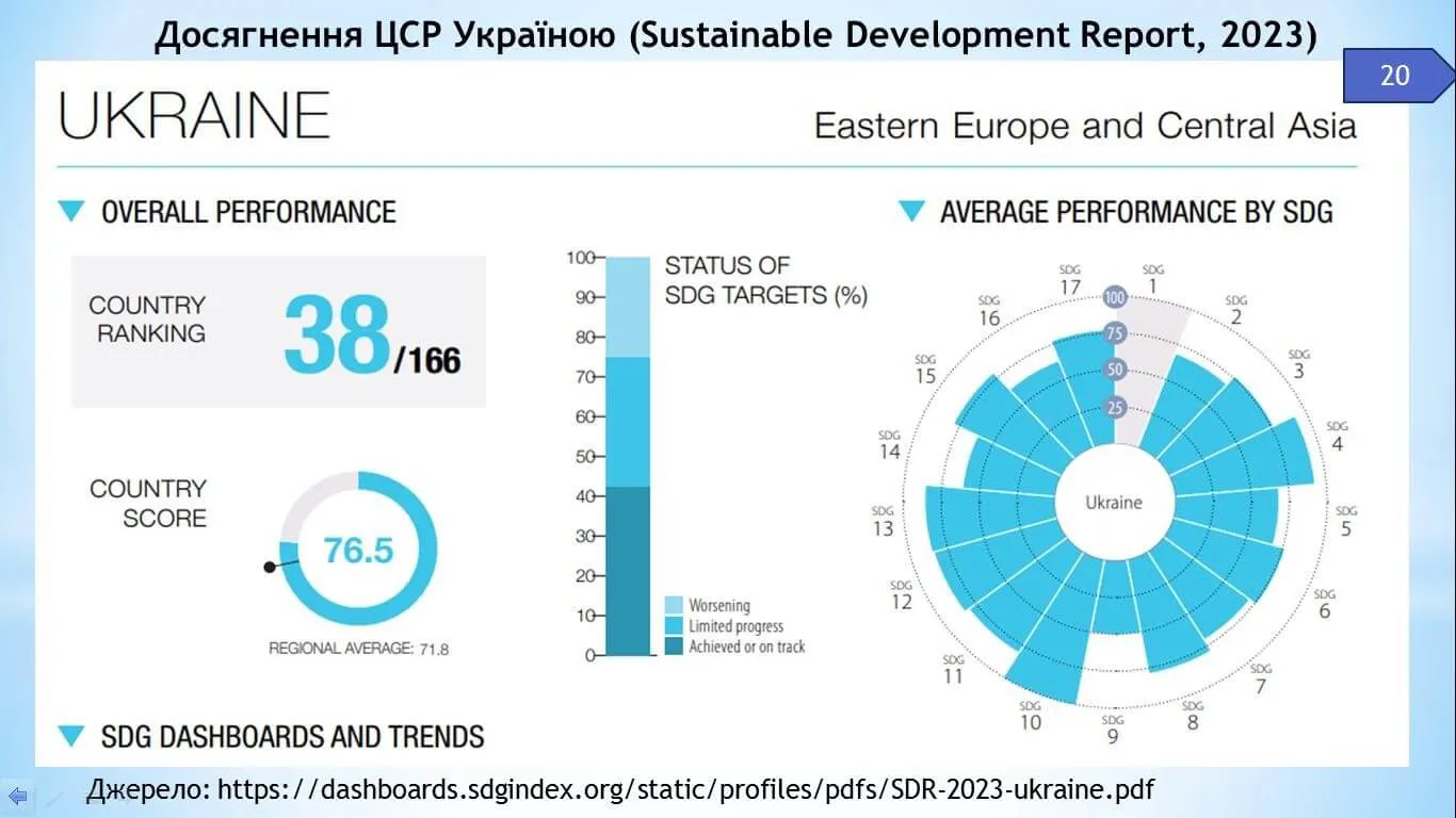 Інша частина доповіді О.В. Зибаревої була присвячена аналізу глобальних та національних рейтингових позицій України за ключовими питаннями сталого розвитку та соціальної відповідальності бізнесу (зокрема, розглянути індекси економічної свободи, сприйняття корупції, показники прогресу досягнення цілей сталого розвитку, рейтинги стійкості та показники сталості українських компаній в умовах війни, індикатори сприйняття соціальної відповідальності молодим поколінням та інші).