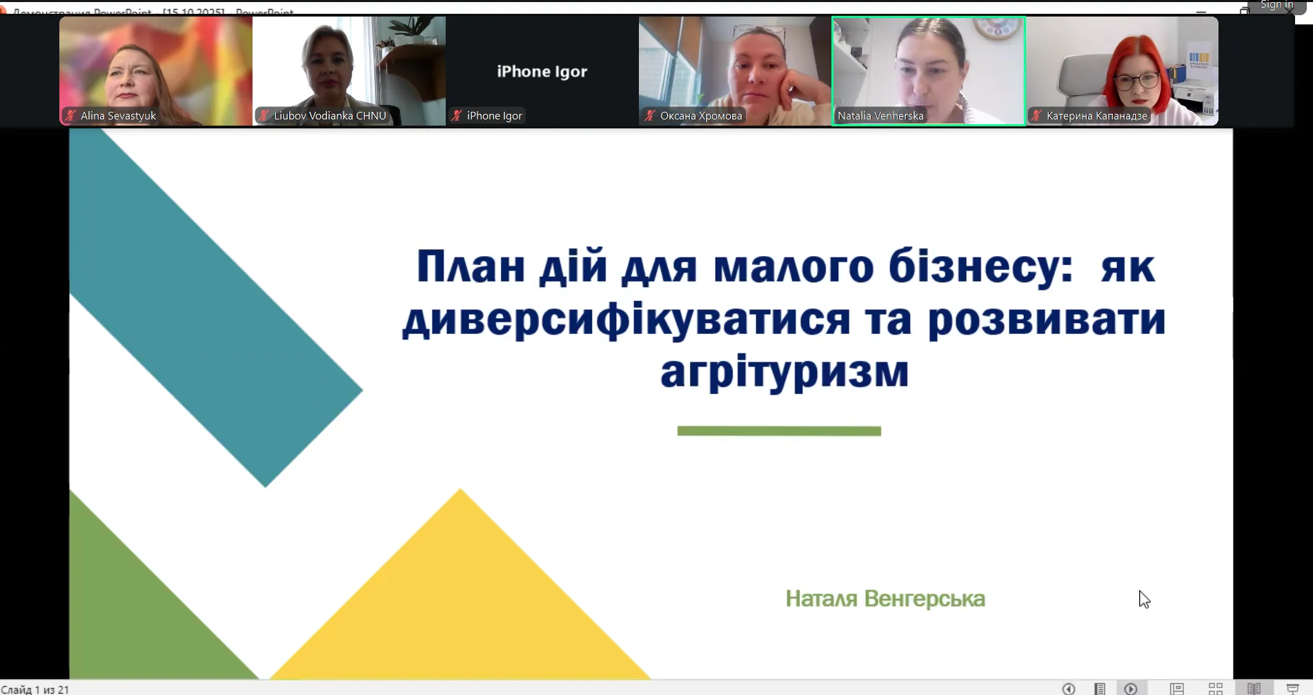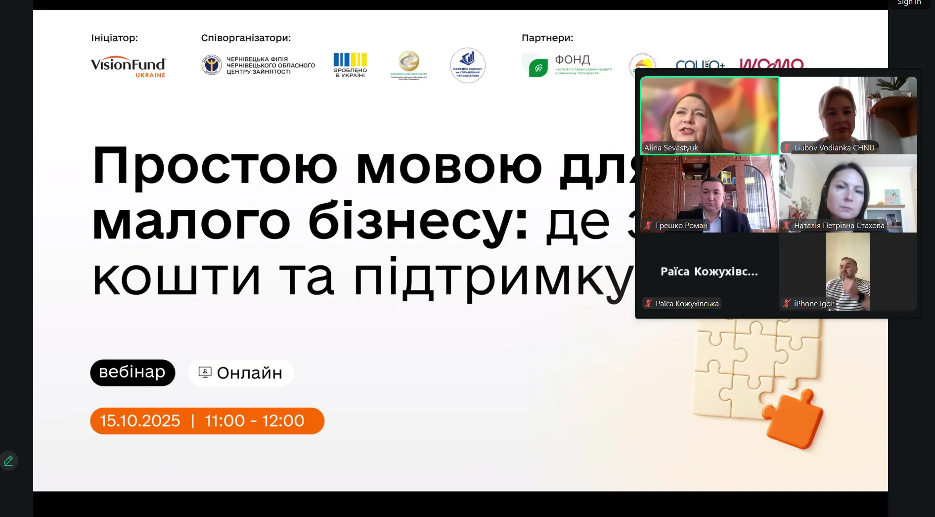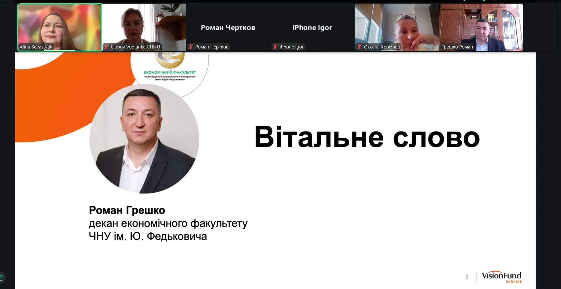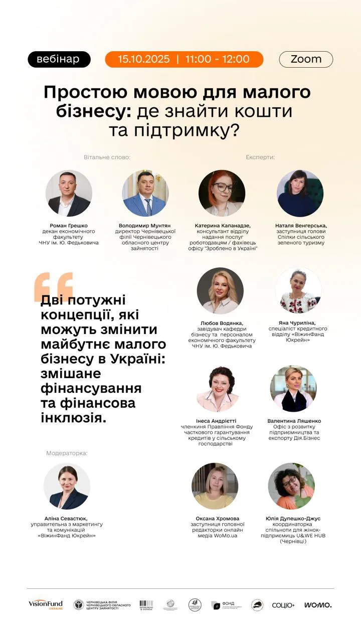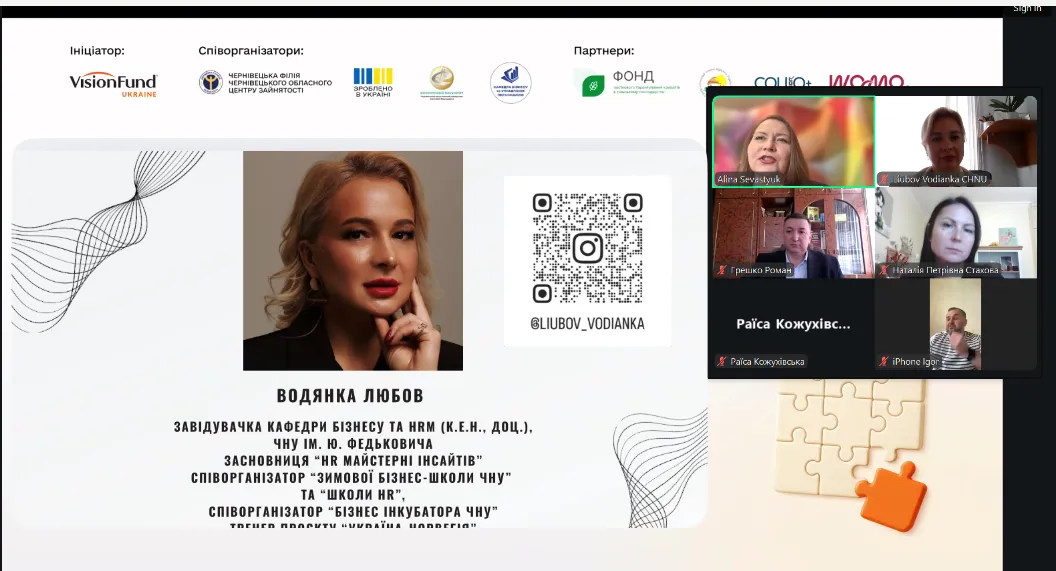 Завідувачка кафедри бізнесу та управління персоналом економічного факультету Чернівецького національного університету імені Юрія Федьковича, кандидатка економічних наук, доцентка Любов Водянка взяла участь як спікерка у Всеукраїнському вебінарі «Можливості поруч: гранти для бізнесу та підтримка», що відбувся за участі Чернівецької обласної військової адміністрації, Чернівецького обласного центру зайнятості та партнерів у сфері розвитку підприємництва.