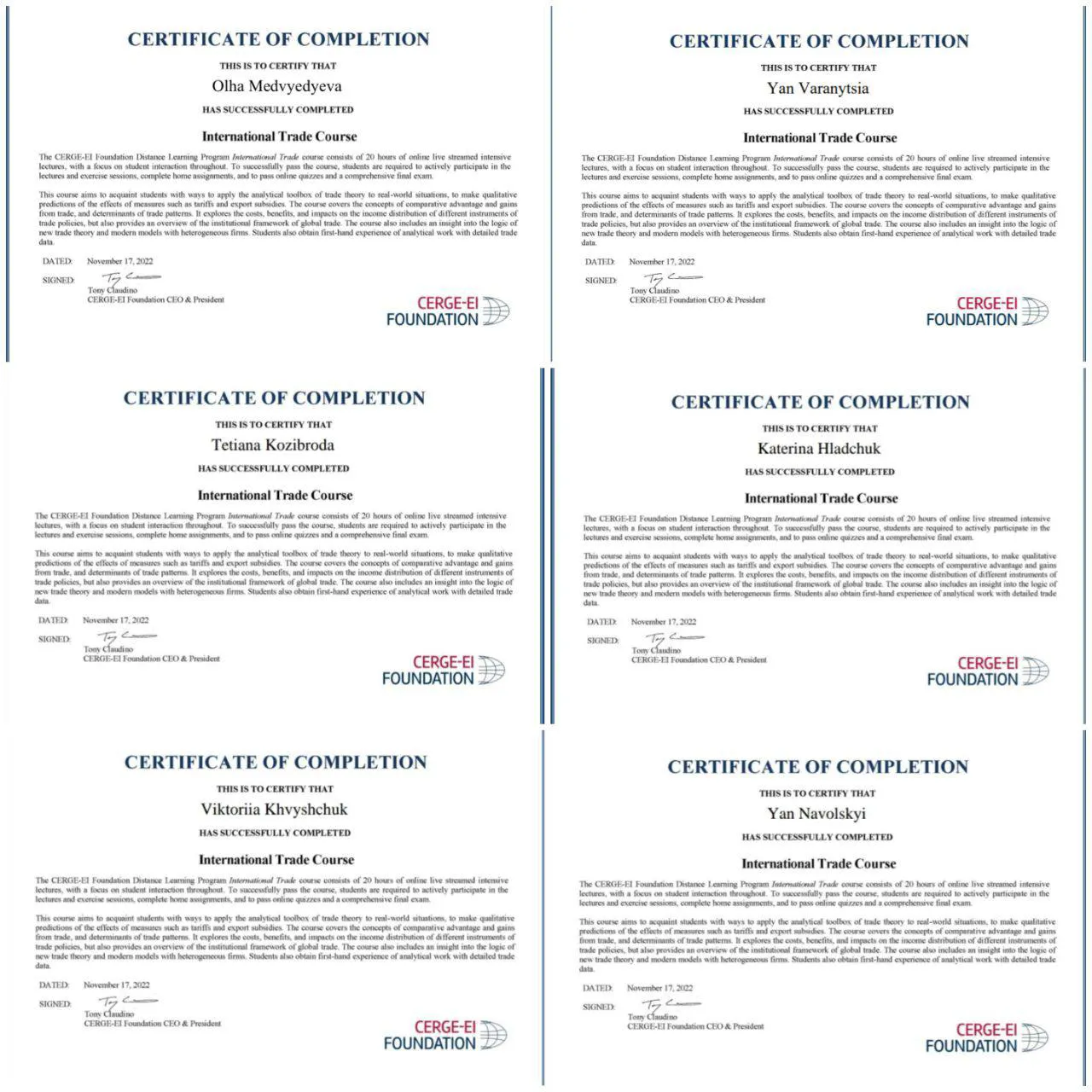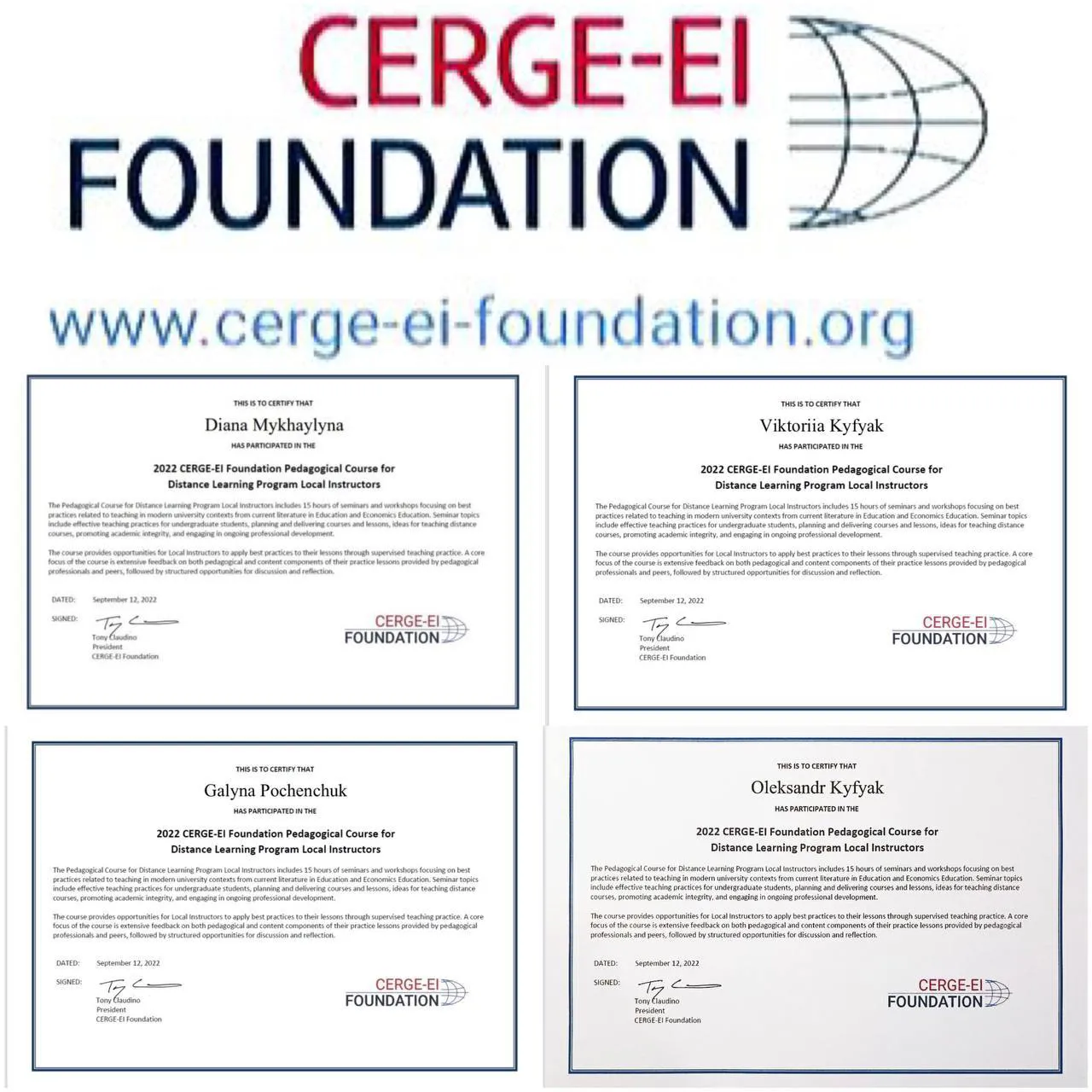 Координатори проєкту від економічного факультету Олександр Кифяк, Вікторія Кифяк, Діана Михайлина та Галина Поченчук пройшли педагогічний тренінг-курс «2022 CERGE-EI Foundation Pedagogical Course for Distance Learning Program Local Instructors», спрямований на освоєння новітніх передових практик інтеграції освіти країн ЄС. Курс передбачав 15 годин семінарських занять та тренінгів щодо сучасних підходів до практики викладання в університеті, включаючи питання взаємодії зі студентами, планування та проведення занять як у традиційному, так і в дистанційному форматі, забезпечення академічної доброчесності та постійного професійного розвитку.