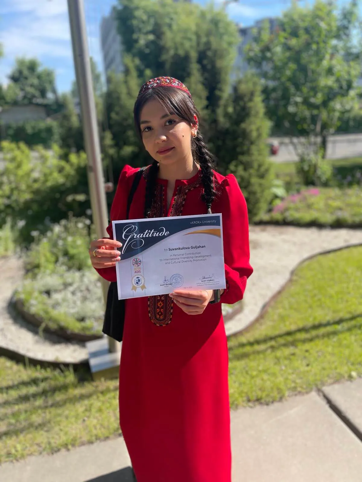 Учасниця від Чернівецького національного університету імені Юрія Федьковича Гульджахан Суванкулова представляла свою країну – Туркменістан. У національному одязі Гульджахан розказала поему відомого на її батьківщині письменника Махтумкулі, а також представила глядачам унікальні відеокадри про життя у Туркменістані. Її виступ отримав гарні відгуки від всіх присутніх в залі. Наш університет вдячний організаторам та учасникам Міжнародних вечорниць.