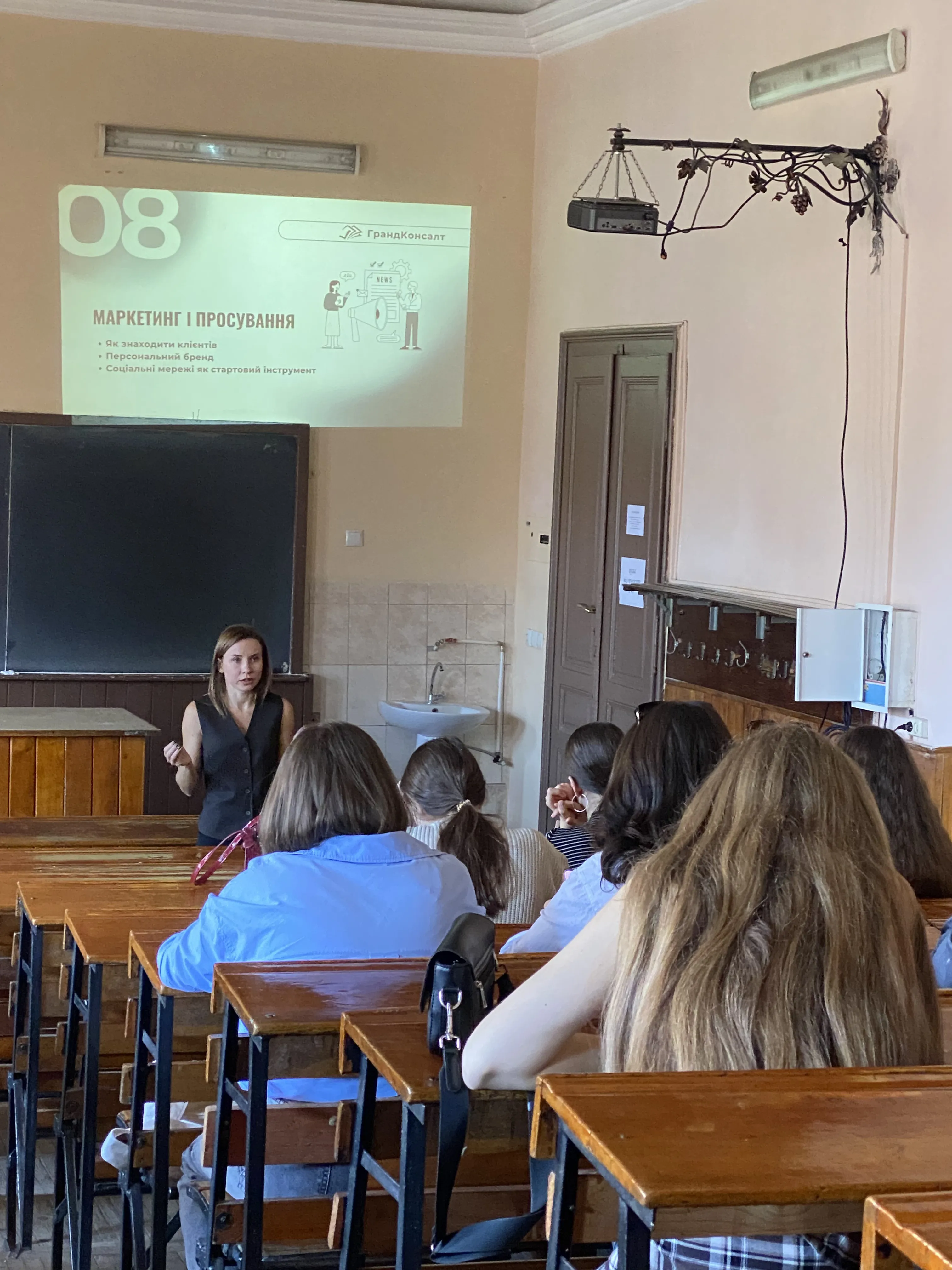 Під час виступу спікерка висвітлила ключові аспекти започаткування власної справи, акцентувавши увагу на особливостях формування підприємницького мислення, ролі професійної підготовки та необхідності стратегічного планування у бізнесі. Значну увагу було приділено практичним аспектам діяльності, зокрема податковому консультуванню та аудитним процедурам.